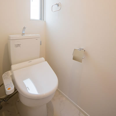 ウォシュレット、ペーパーホルダー、タオル掛け、カウンター棚、照明器具