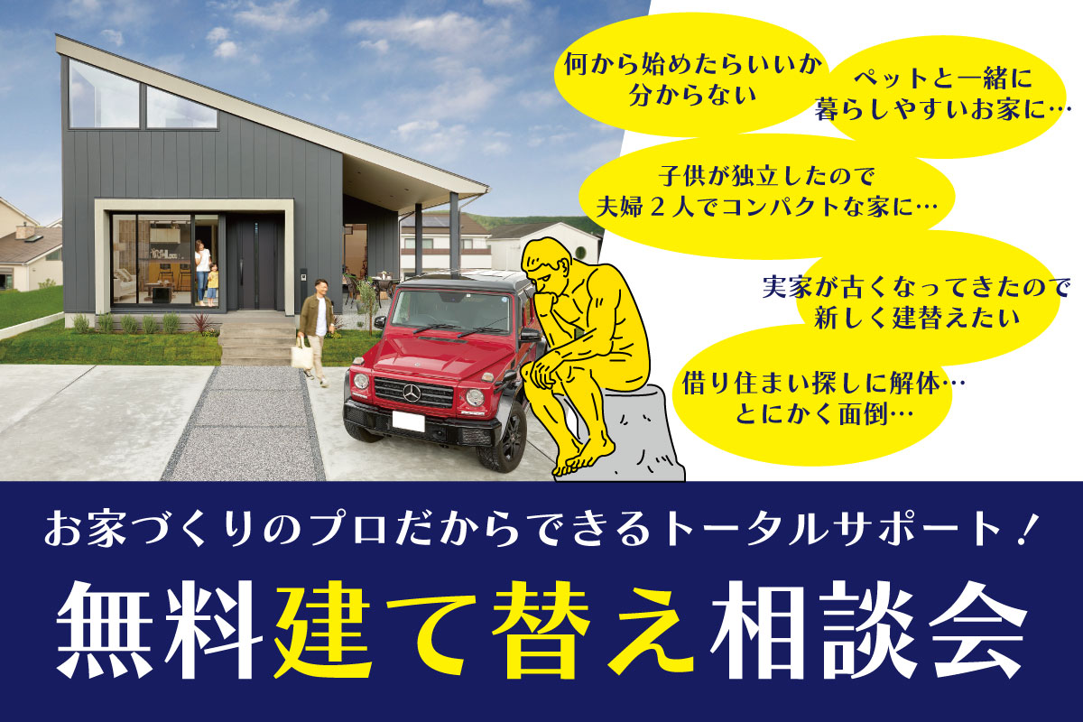 - "何からすればいいか分からない"そんなお悩みを持たれる方をトータルサポート! 建て替え相談会を開催いたします! 創業71年の地域密着工務店として、お家づくりをお手伝い致します! 完全予約制となっておりますので、事前のご予約をよろしくお願い致します。