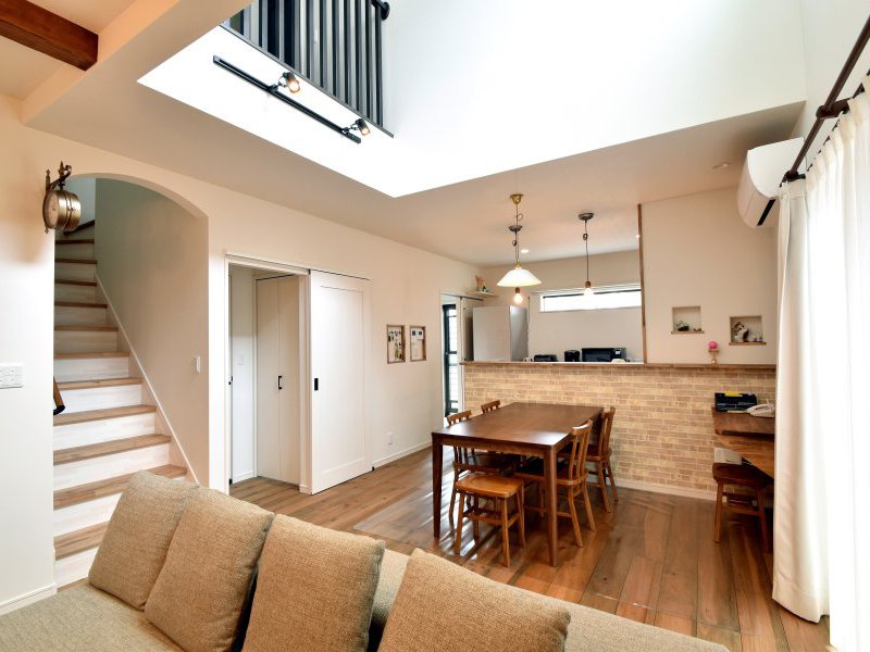 ダイニング上部に大開口の吹き抜け、南面に大きな掃き出し窓、