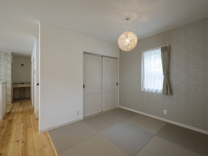 和室の色合いを室内のアクセントクロスに合わせた半帖畳に、