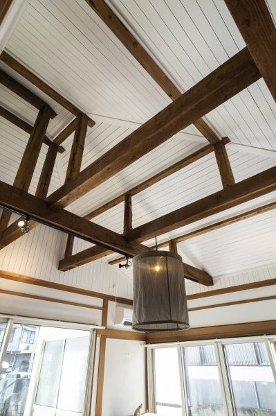 古い住宅に使用された自然のエイジングが施された天井や梁に柱。