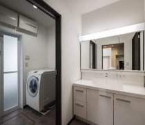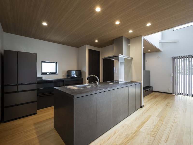 設備はブラックを基調としつつ、床は無垢床の明るい色にすることで