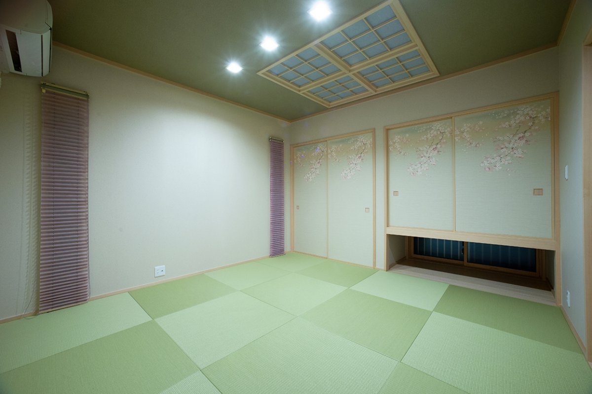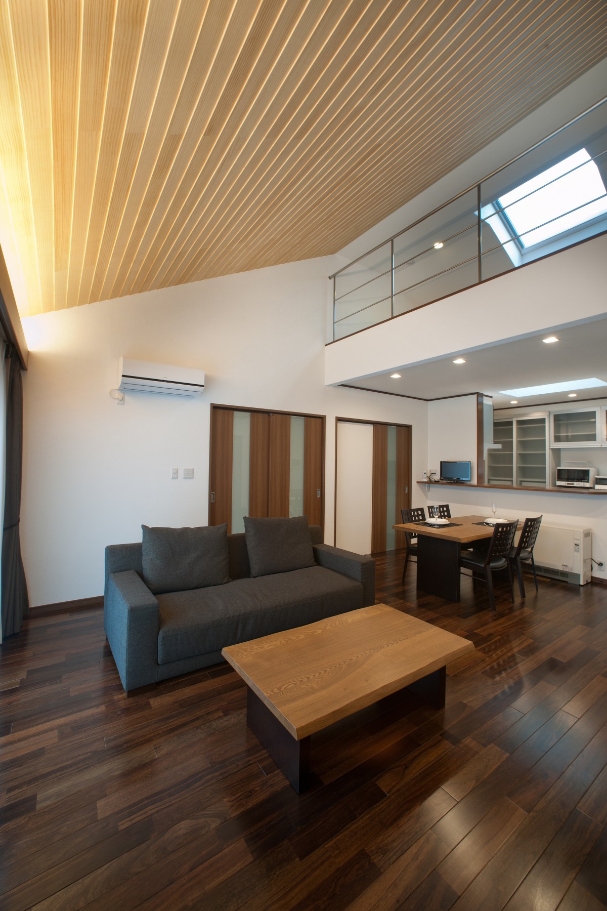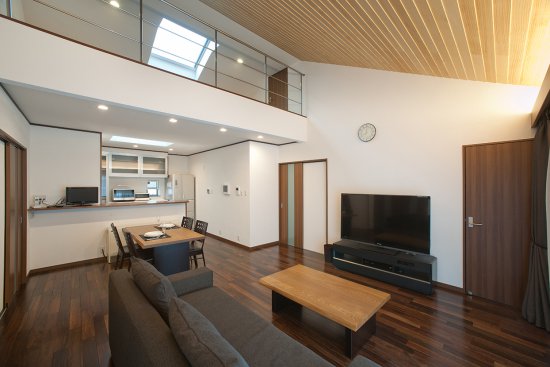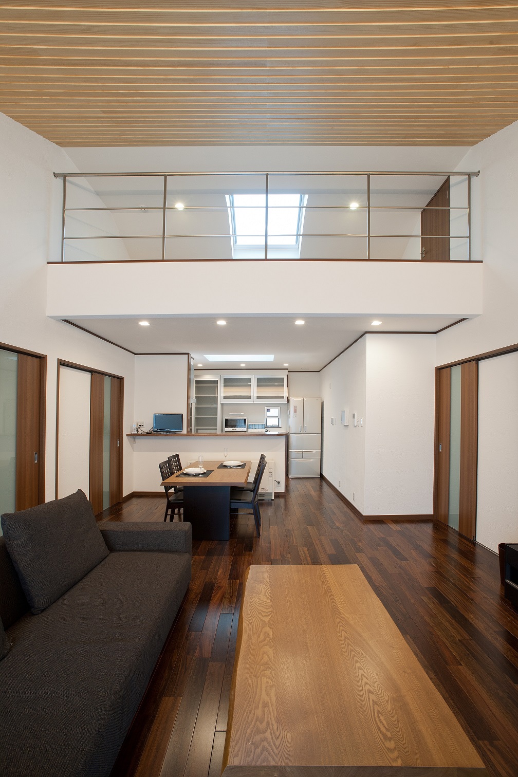 落ち着いた雰囲気の平屋のお家です。 玄関はゆったり8畳、LDKの天井は 無垢材を鎧張りにしたもの。 書斎にある階段をのぼれば、広々としたロフトへ。