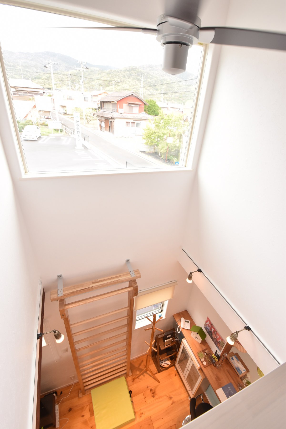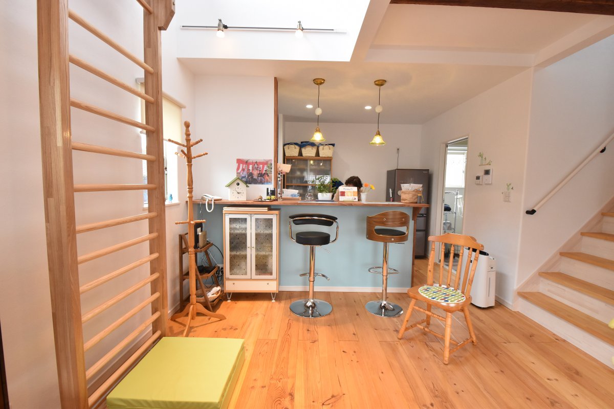 カフェオレ色のカラフルママンのお家に、 お家で運動ができるように「肋木」を付けました! 吹き抜けで明るく、 そして健康で元気に暮らせるお家です。 ダイニングテーブルは置かずに お食事の為の広いカウンターを設けて、 広々空間を実現しました。