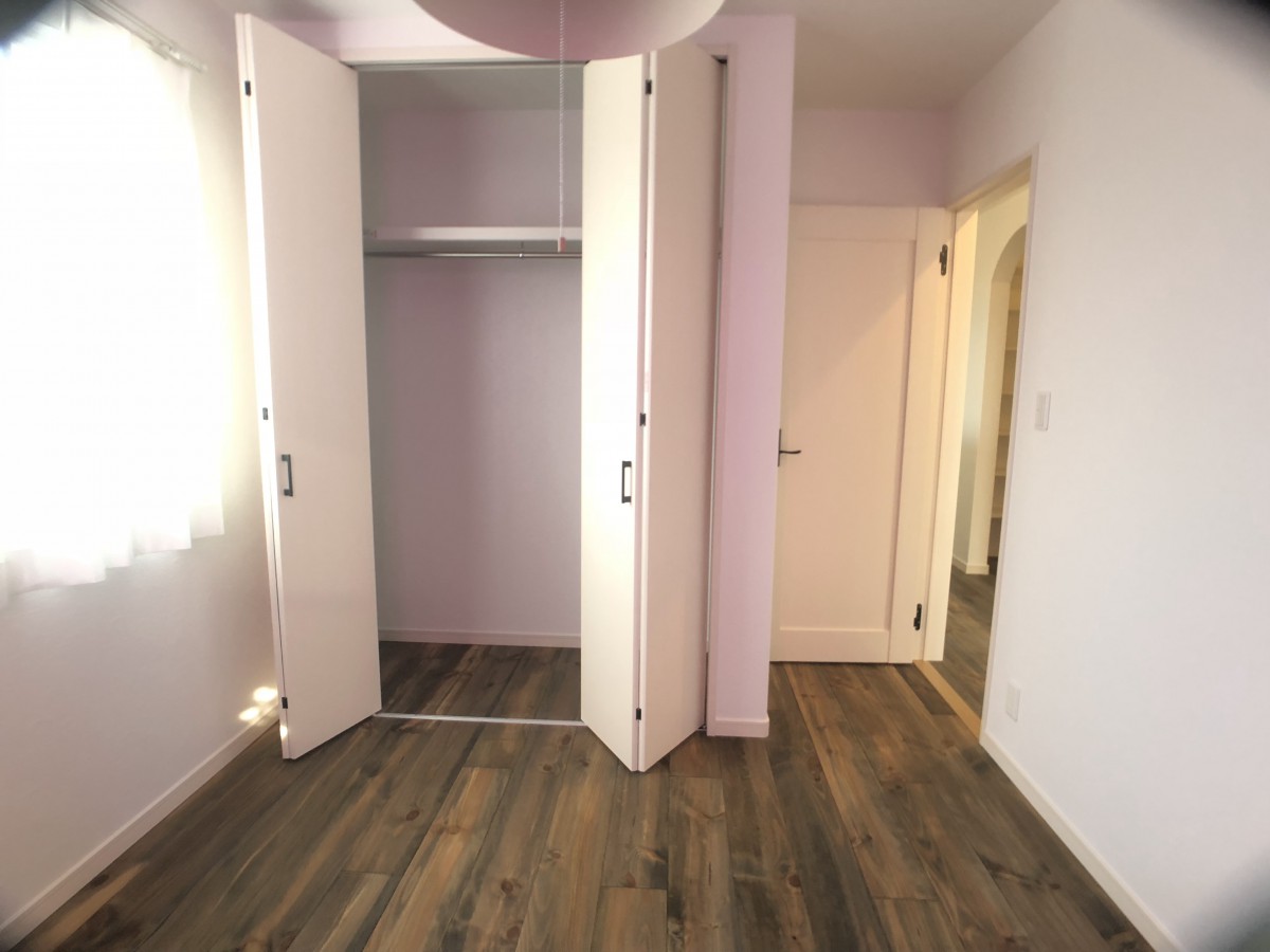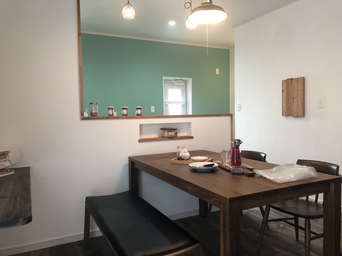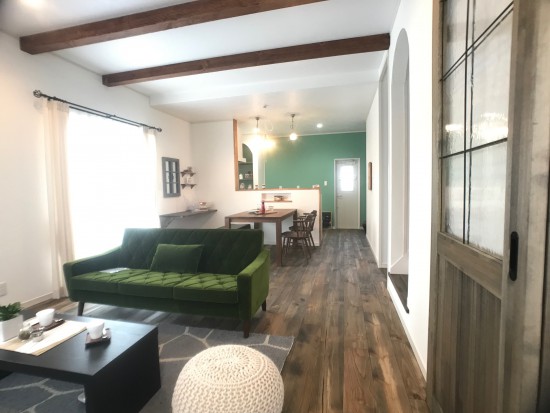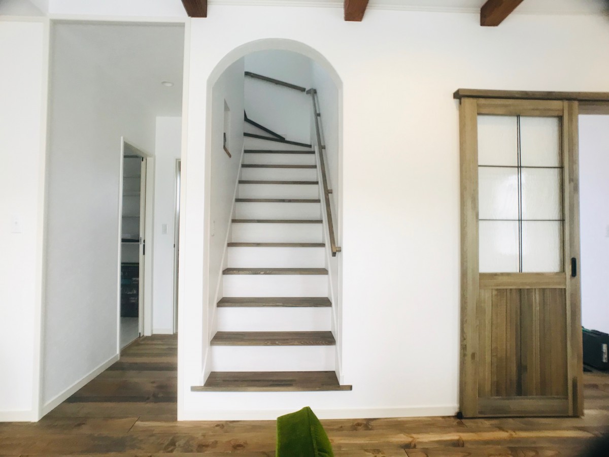 32坪のカフェ風住宅ママンのお家です。 こだわりのお洒落なリビングドアが、 カフェらしさを引き立ててくれます♪ アーチ状の垂れ壁や玄関ドアが可愛らしい雰囲気に。 3LDKのおうちです。