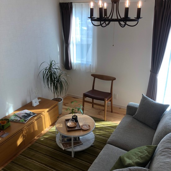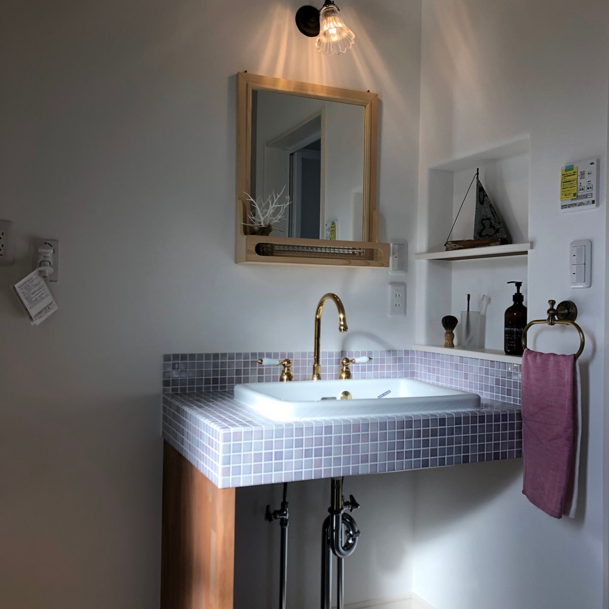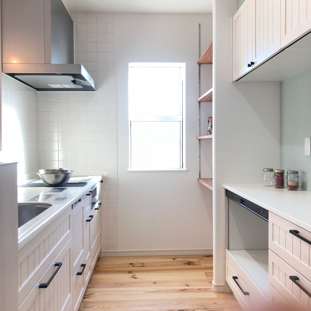 玄関にはシャンデリアタイプの照明、 無垢材の床板や見せ梁、ナチュラルな キッチンとお揃いのカップボード。 ニッチに可愛い雑貨を飾って、まるで カフェのような可愛いママンの家です♪
