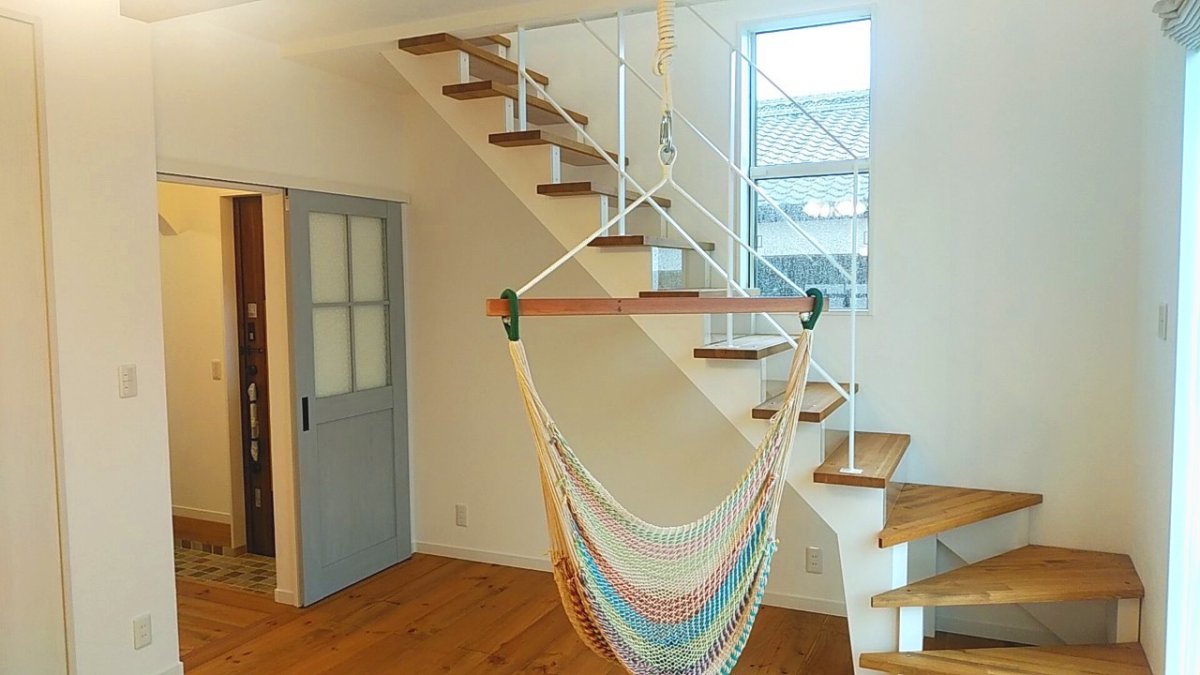 いつでも家族の存在を感じられる広いリビングにはハンモックをつけ、