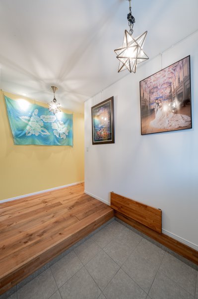 玄関の扉を開けると、鮮やかな黄色のクロスと