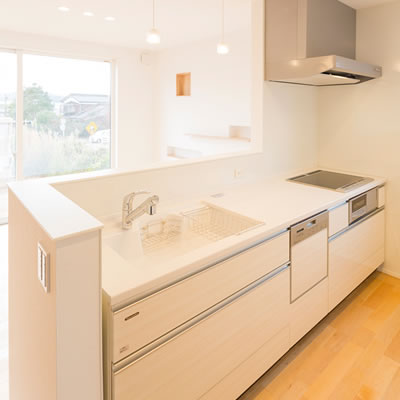 システムキッチン(ステンレストップ)、IHヒーター混合水栓、レンジフード(シロッコファン)、照明器具フロアコンテナ・スライド収納付き※プランによりキッチンのサイズが変わります。