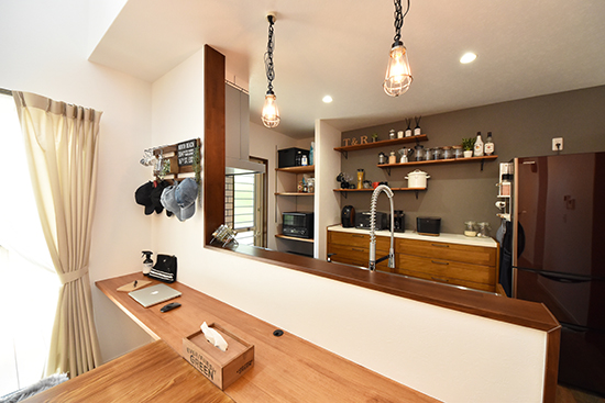 有香は落ち着いた色のウォールナット、キッチンのタイルはこだわってお洒落な小口平タイルにしました。それから推薦も普通のじゃなくて、結構インパクトのあるものを選びました。 -