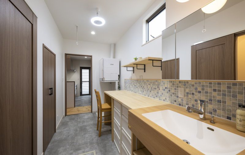 他には、脱衣所を広くしました。多分この大きさの平屋だったらかなり広めにとっている方だと思います。妻のドレッシングルームだったり、作業ができるスペースを取りたいという目的もあったので。 -