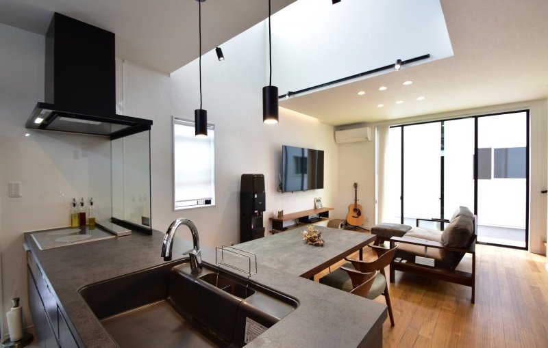 明るい空間で暮らしたいと考えていたので、LDKに大きな吹き抜けを設けました。南面に大きな窓を、キッチンの後ろに横窓も。